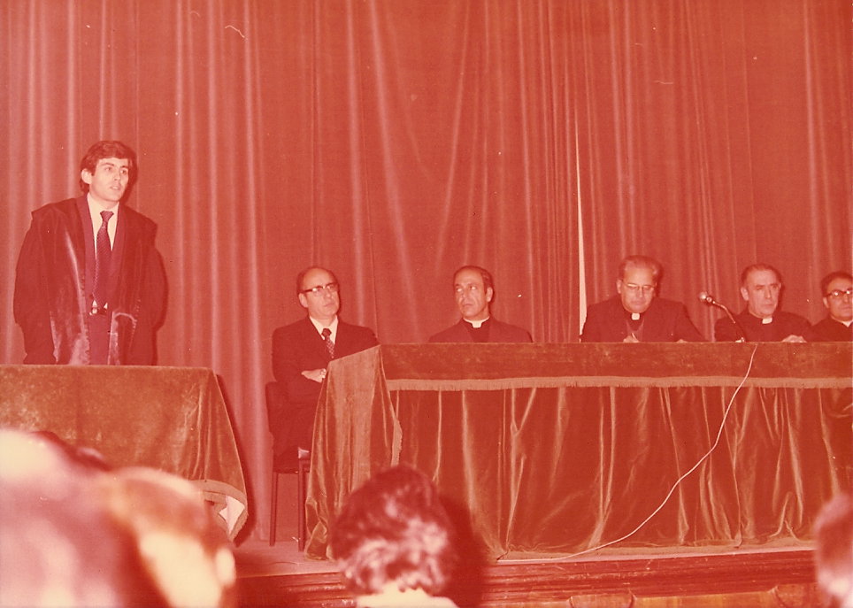 Aquí está la foto de ese primer discurso, en la que aparece el propio Miguel Rodríguez Rubio, el Rector, el primer Decano y el Padre Jiménez.